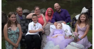 It was on June 29 that Emma’s big day became a reality, with Emma arriving at the venue in a wheelchair pushed by her parents. She donned a beautiful purple dress for the occasion, and beamed as her father escorted her down the aisle.